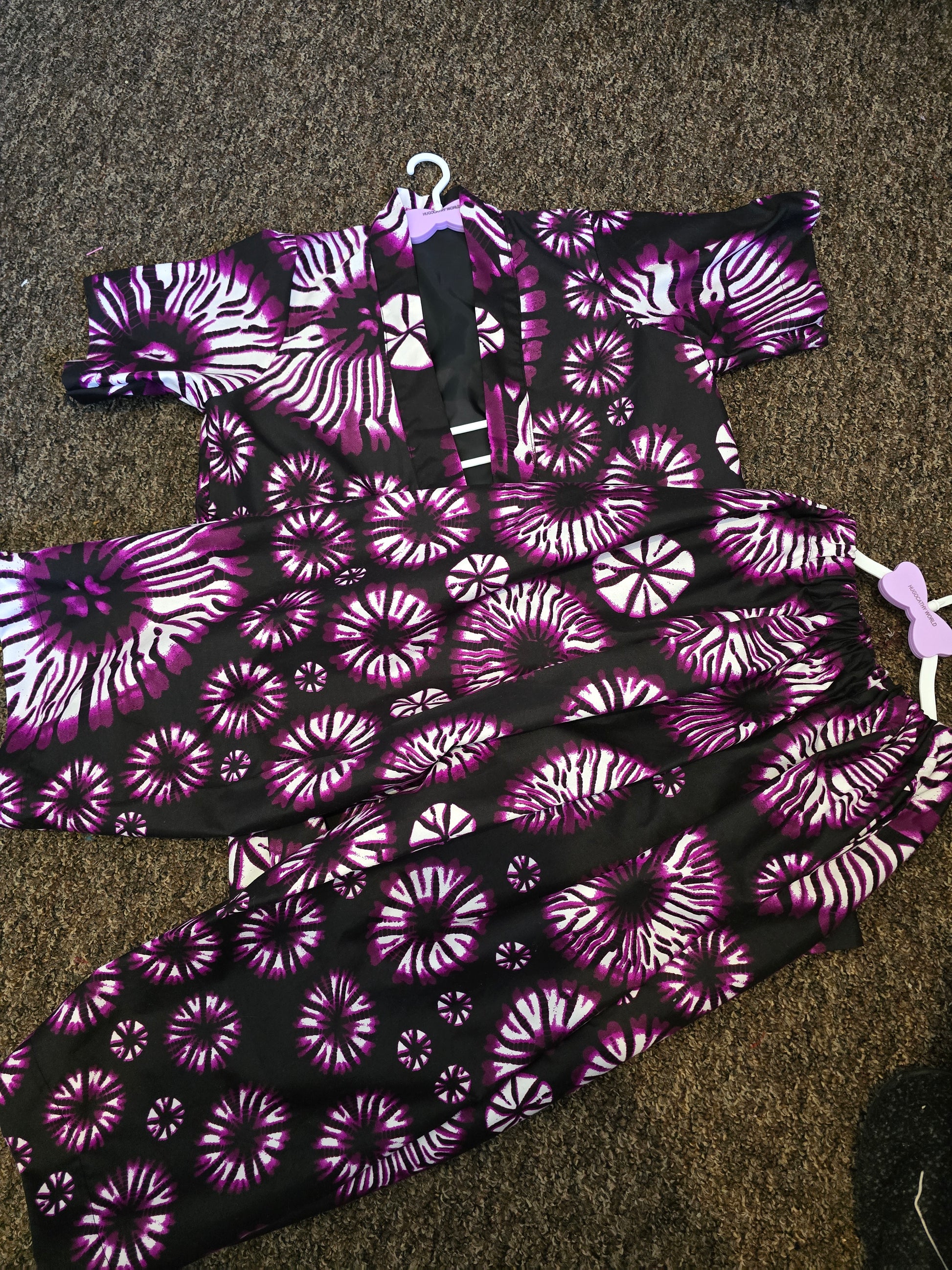 Bright and playful Two piece African print kimono jacket and Elastic waist trouser and wide bottom leg, with bold purple burst patterns. Lightweight, comfortable, and perfect for everyday wear or special outings